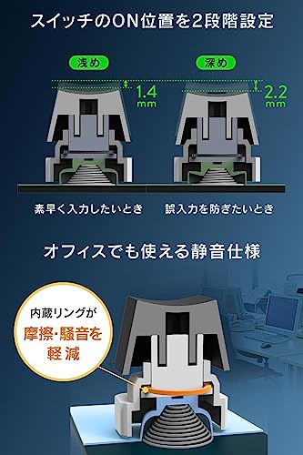 荷重45gという標準的なタイプですが、アクチュエーションポイントを1.4mmと2.2mmの2段切り替え方式とすることで、普段利用とゲームタイトル別に切り替えて使用可能です。
