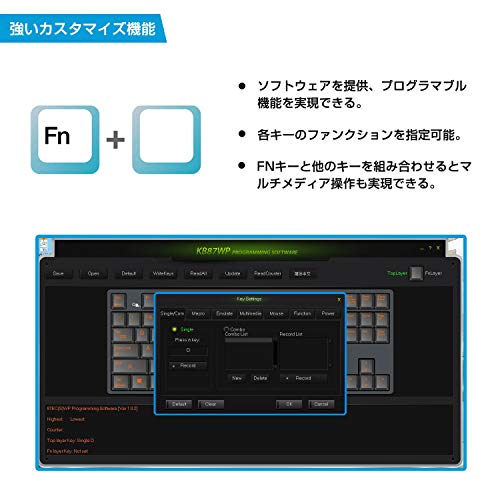 ゲーミングソフトにより、バックライト色やF1~F4キー割り当て変更といった設定が可能であって、キーロールオーバー数も6キーと30キーをソフトウェア切り替え方式を採用しています。