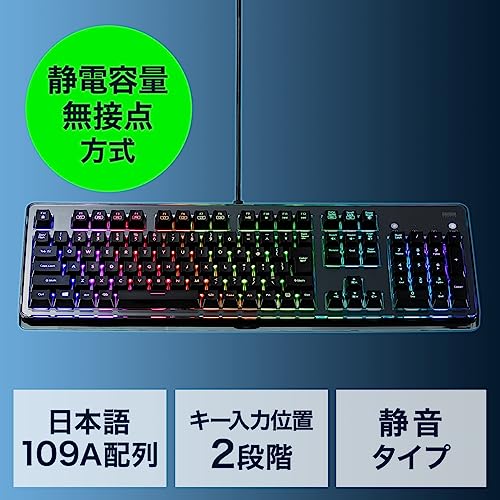 400-SKB060は、サンワサプライから販売されている静電容量無接点方式を採用しつつ2万円を切るモデルとして静音性重視のゲーマーに支持されています。
