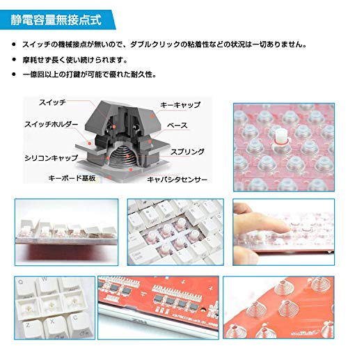 【確実にタイピングと耐久性・静音】静電容量無接点式のスイッチ軸、高い反応スピード。複数のキーを同時に押しても衝突しません。スイッチの機械接点が無いので、ダブルクリックの粘着性などの状況は一切ありません。摩耗せず長く使い続けられて、一億回以上の打鍵が可能で優れた耐久性を誇ります。